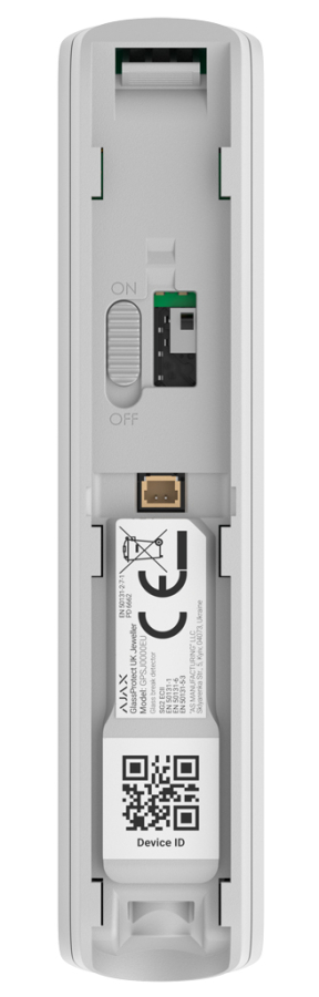 - QR код с идентификатора на устройството. Използва се за сдвояване на устройството със система Ajax.