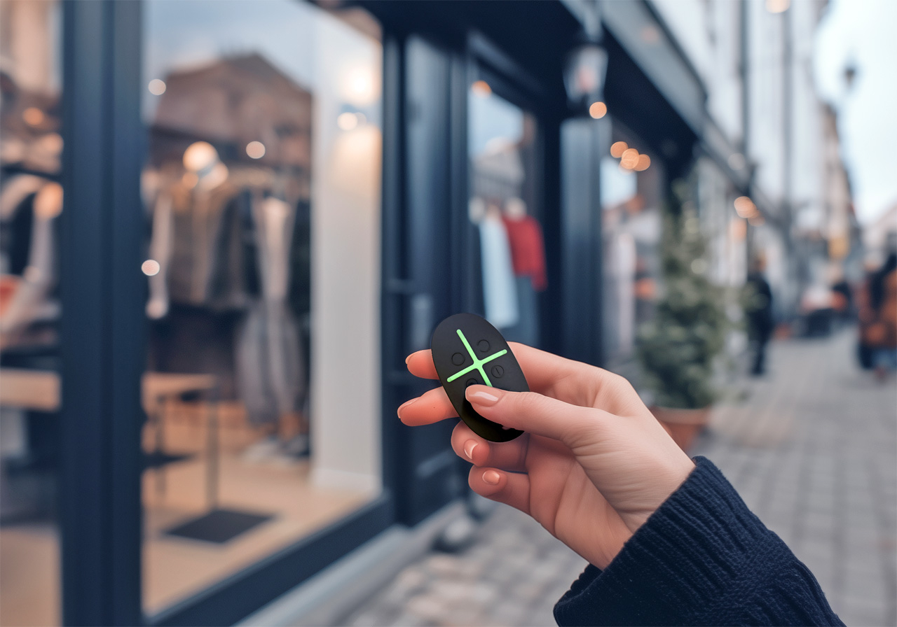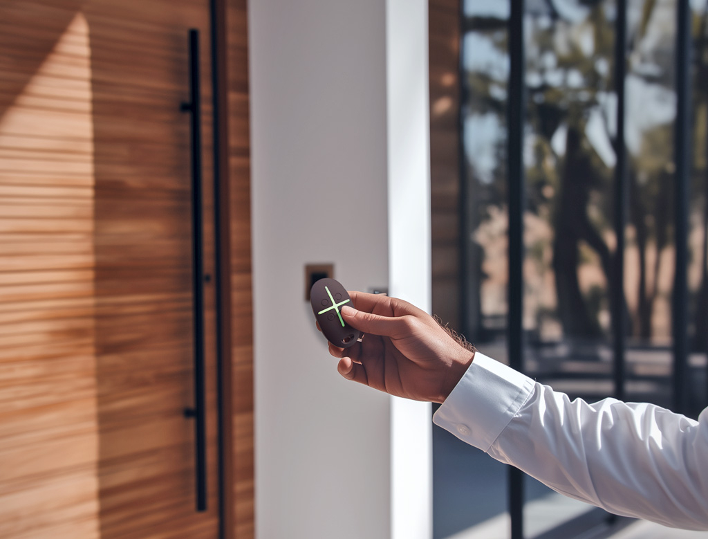 Радиокомуникационната система на безжичния ключодържател защитава устройството от фалшифициране и криптира информацията, която ключодържателят обменя с хъба. Този принцип на работа осигурява сигурност на сигнализацията от опити за хакерство от страна на нарушители на високо ниво. Благодарение на двупосочната комуникация с контролния панел на хъба, ключодържателят потвърждава доставянето на алармената команда. Комуникационната система на сензора му позволява да работи непрекъснато на открити пространства до 1300 м от алармен контролен панел или на няколко етажа на сграда.