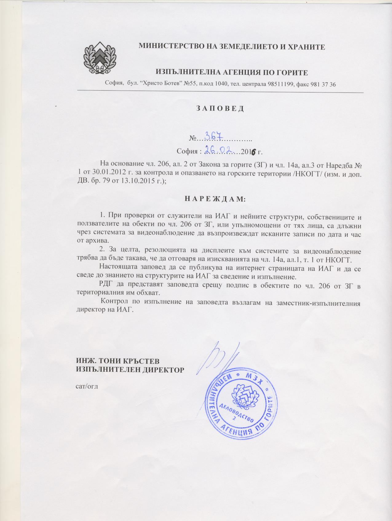 Заповед № 367/26.02.2016 г. на изпълнителния директор на ИАГ - ИЗТЕГЛИ