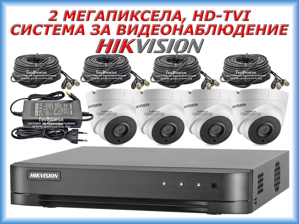 Система за видеонаблюдение HIKVISION - 2 MPX, HD-TVI: 4 канален видеорекордер, 4 куполни камери с EXIR инфрачервено осветление до 40 метра, 4 x 20 метра кабели и захранване със сплитер за 4 камери