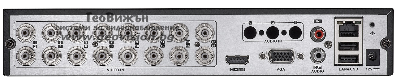 Синхронизиран плейбек от 16 камери, Мрежов интерфейс: 1 x 10/100 Mbit LAN, Алармени входове и изходи: няма, USB портове: 2 x USB 2.0, Графично меню на Български език, Включена мишка за управление, Захранване: DC12V, консумация без твърд диск ≤20W, Работна температура: -10~+55оC, влажност до 90%. Размери: 260x222x45 mm.