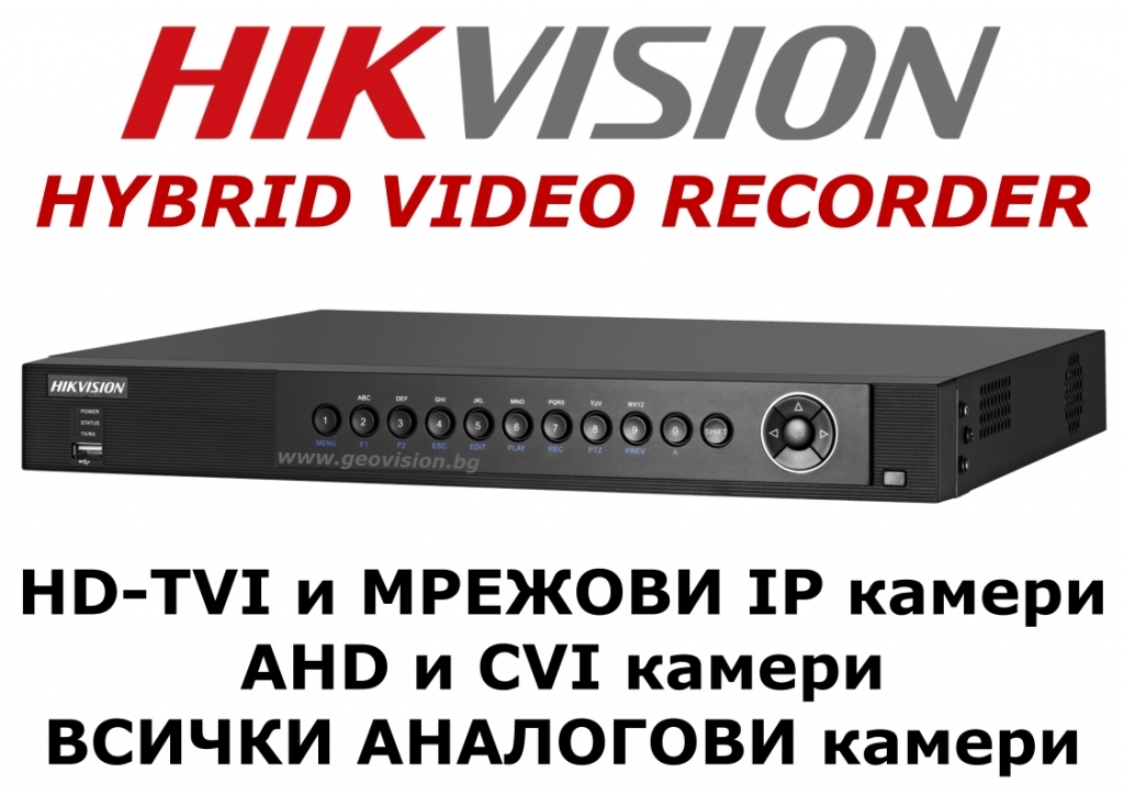 4 канален професионален хибриден видеорекордер HIKVISION DS-7604HUHI-F1/N. Поддържа 4 HD-TVI камери до 3 MPX, AHD и CVI камери до 1 MPX или 4 аналогови камери /свободно избираемо/ + 4 мрежови IP камери до 8 MPX. Общ брой поддържани камери - 8