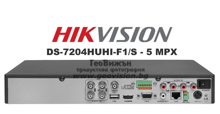 4 канален професионален хибриден видеорекордер HIKVISION DS-7604HUHI-F1/N. Поддържа 4 HD-TVI камери до 3 MPX, AHD и CVI камери до 1 MPX или 4 аналогови камери + 4 мрежови IP камери до 8 MPX