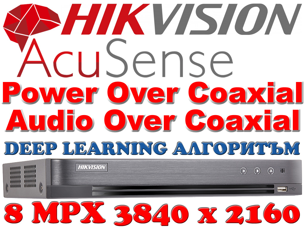 8 канален професионален AcuSense цифров видеорекордер HIKVISION iDS-7208HUHI-M2/P(C)/A, с поддръжка на Power Over Coaxial и Audio Over Coaxial. Поддържа 8 HD-TVI камери до 8 MPX + 8 IP камери до 8 MPX