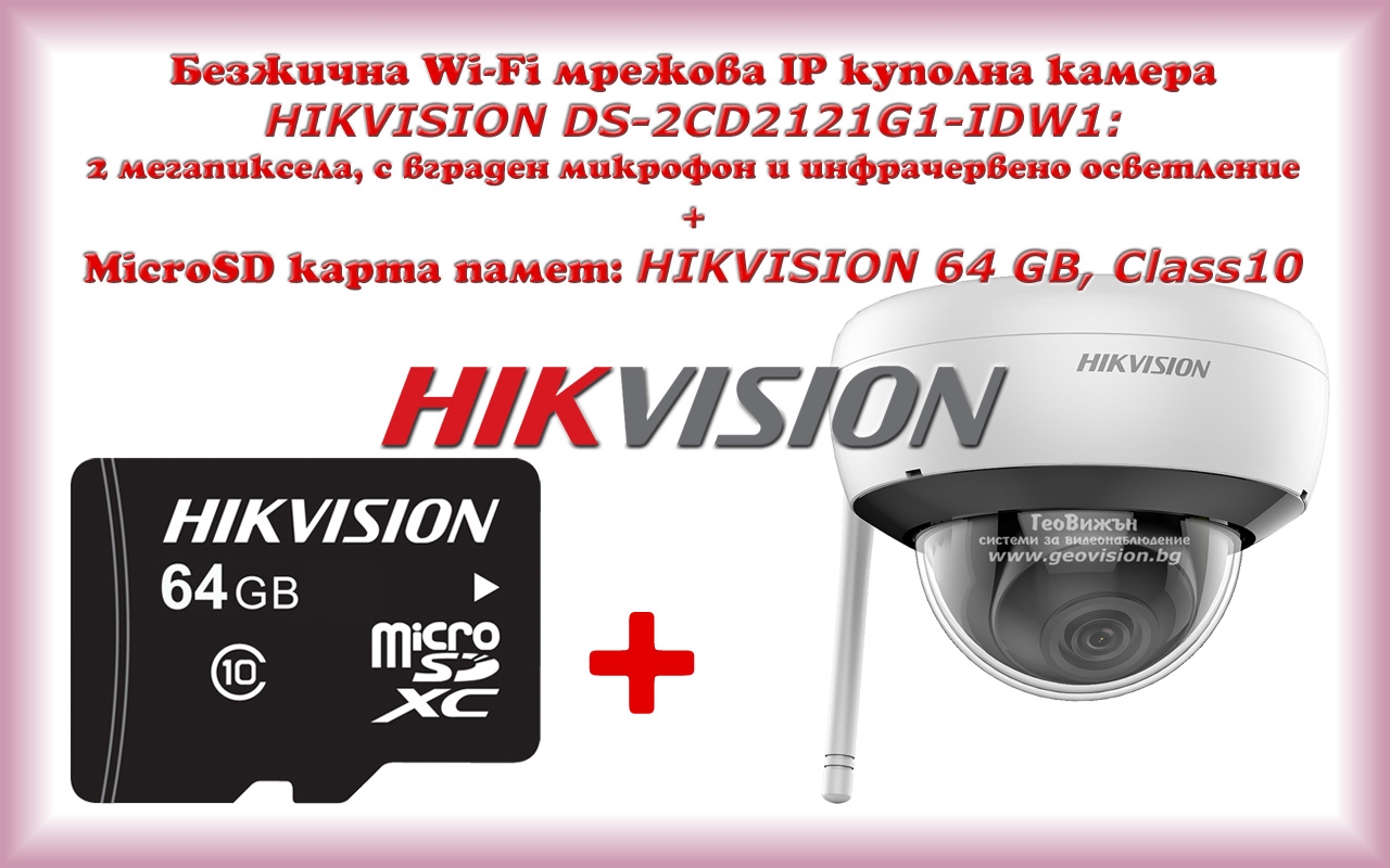 Безжична Wi-Fi мрежова IP куполна камера HIKVISION DS-2CD2121G1-IDW1 - 2 мегапиксела, Обектив: фиксиран 2.8 mm, с вграден микрофон с шумов филтър + MicroSD карта памет HIKVISION 64 GB