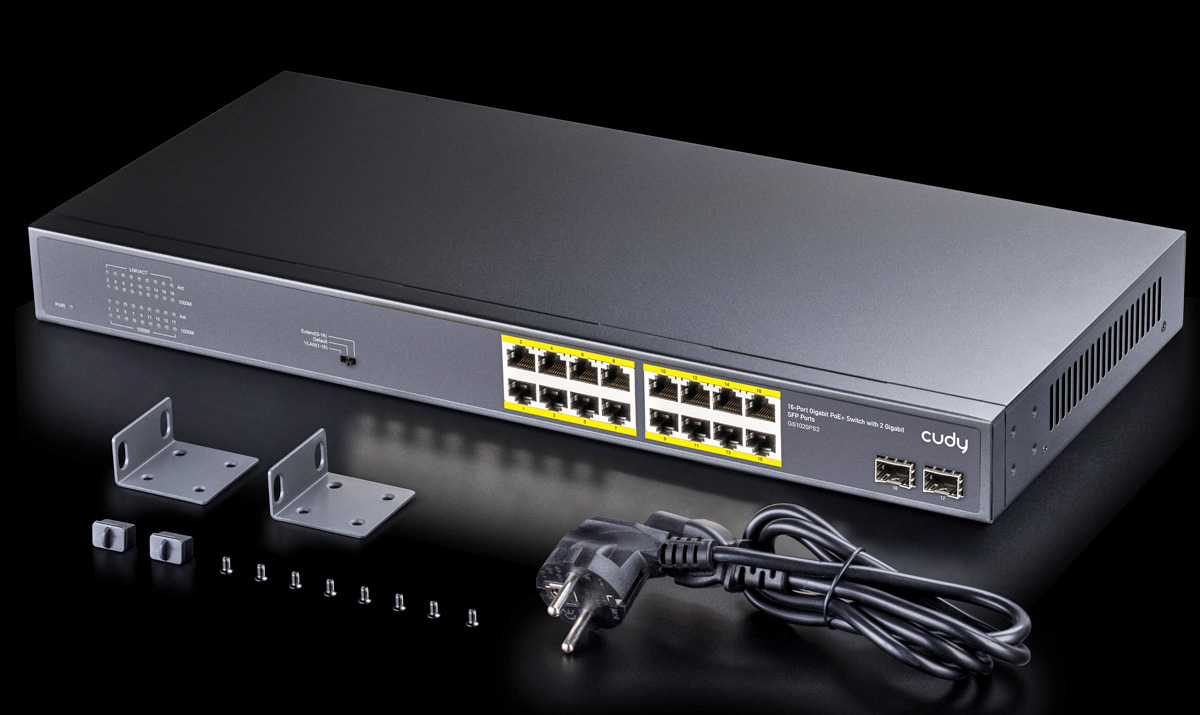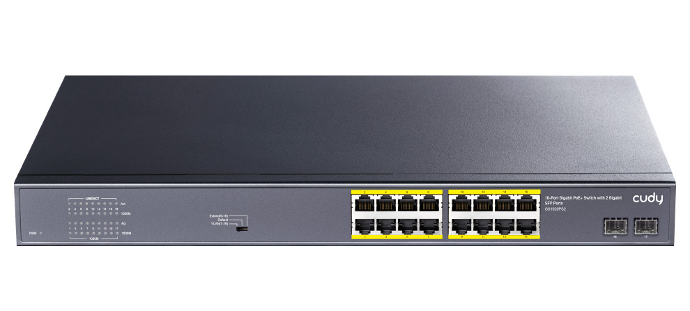 Cudy GS1020PS2: 18 портов суич с 16 x 10/100/1000 Mbps PoE порта + 2 x 1 Gbps SFP uplink порт. До 30 W на PoE портове 1-16. Общ PoE капацитет 200 W