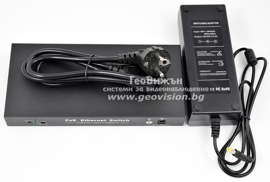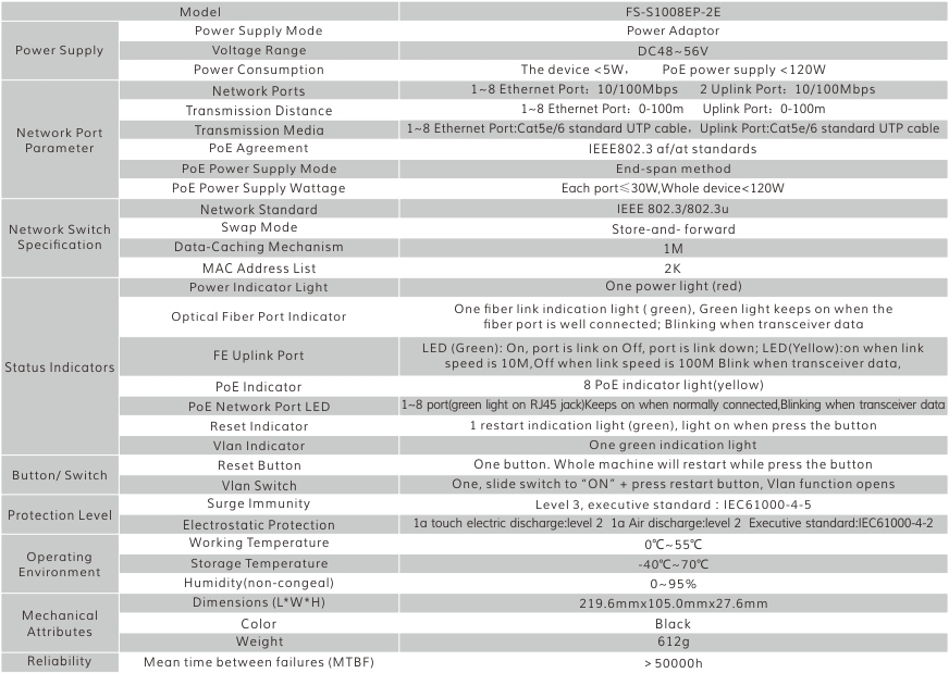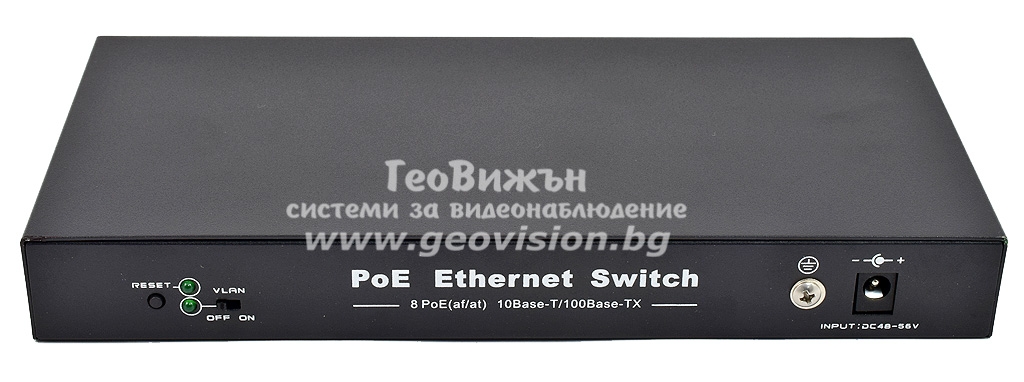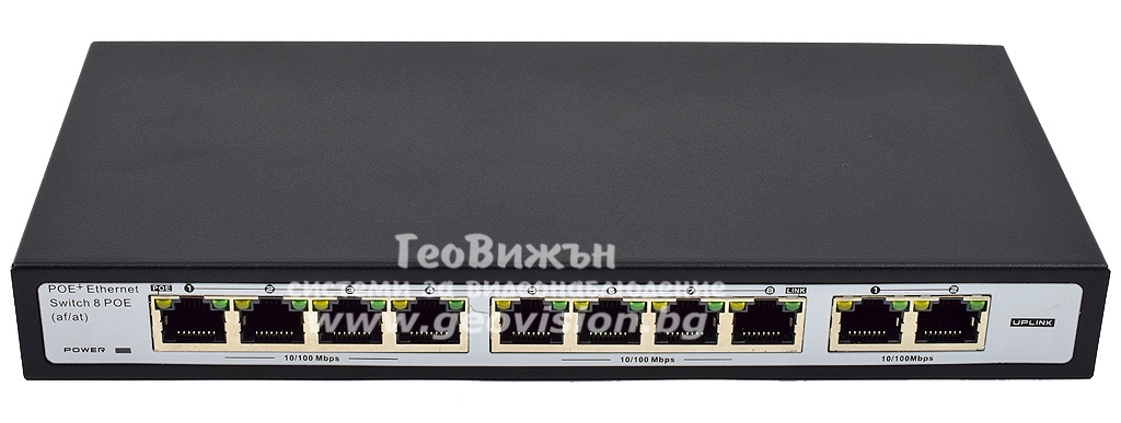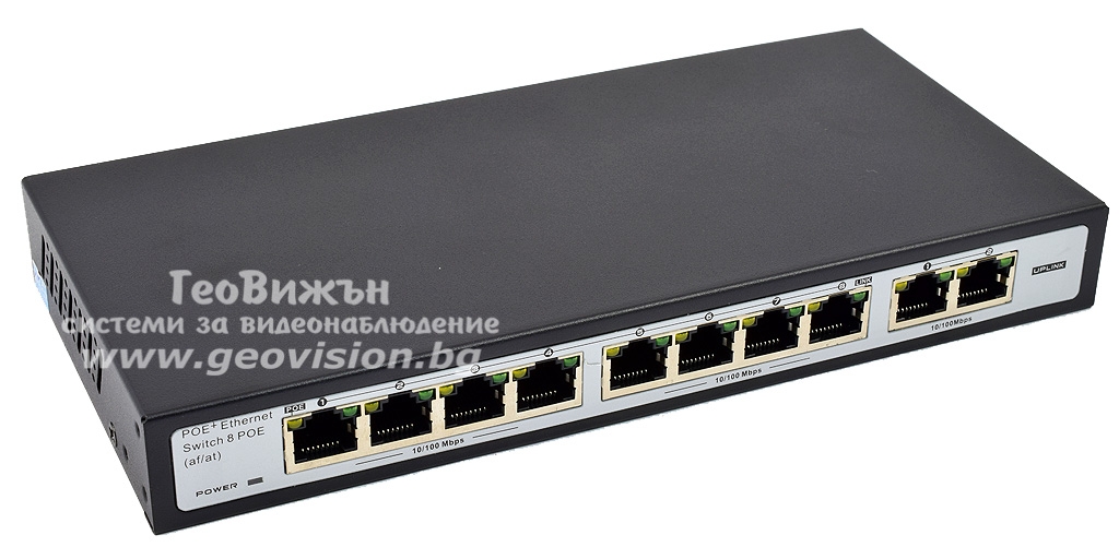 FOLKSAFE FS-S1008EP-2E: 10 портов суич с 8 x 10/100 Mbps PoE порта за IP камери + 2 x 10/100 Mbps uplink порта, до 30 W на порт. Общ PoE капацитет 120 W