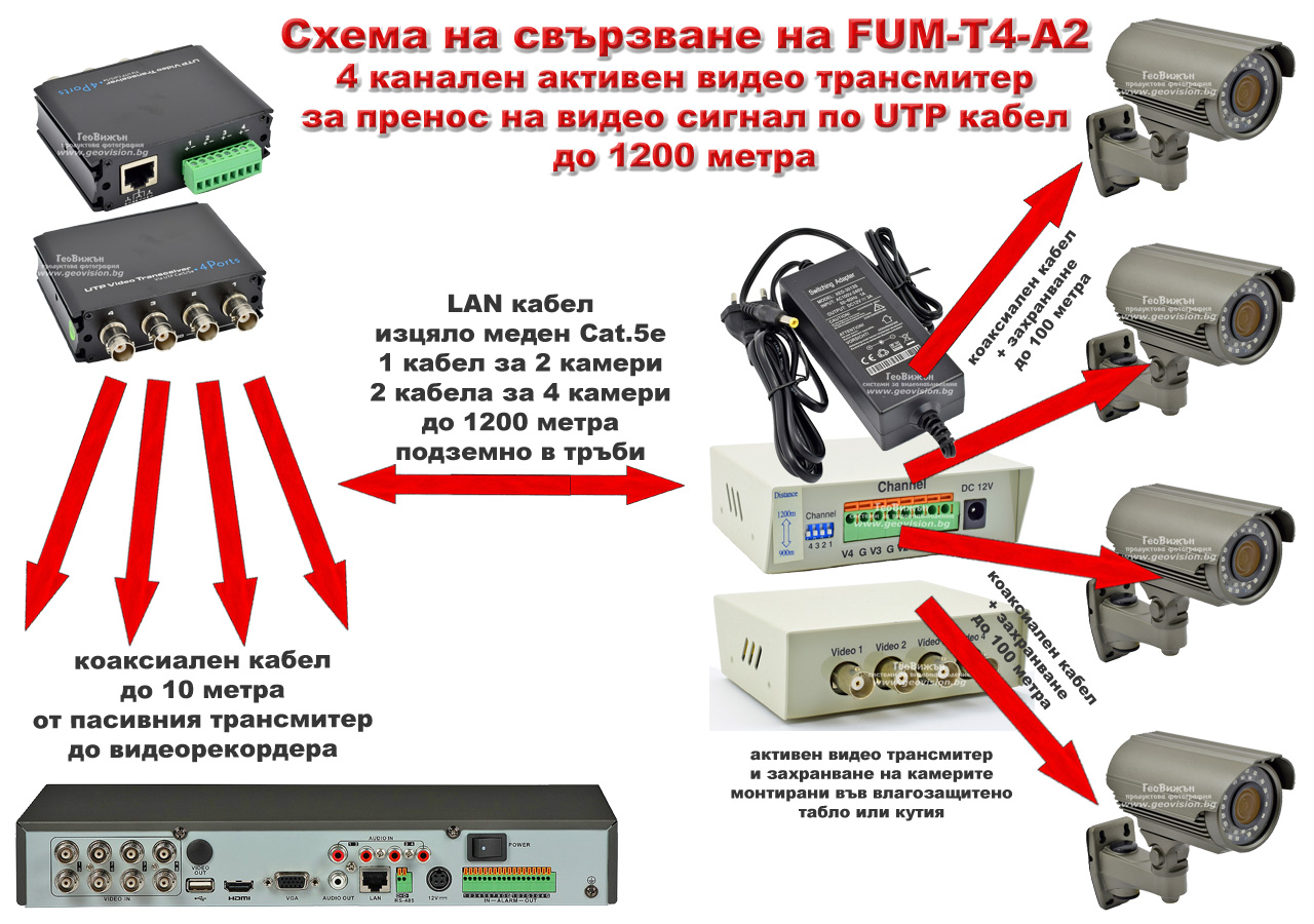 Схемата на свързване е следната: Активният трансмитер FUM-T4-A2 се монтира от страната на камерите. Ползват се по 2 усукани двойки от кабела за 1 камера. За 4 камери са необходими 2 LAN кабела тъй като 1 кабел има 4 усукани двойки. Желателно е кабела да е изцяло меден Cat.5e. От другата страна на LAN кабела /при видеорекордера/ може да се монтира или 4 портов пасивен трансмитер или видео балуни за всяка камера. Камерите се свързват към активния трансмитер чрез коаксиален кабел. Дължината на коаксиалния кабел от активния трансмитер до всяка една камера не трябва да е повече от 100 метра. Това е изпробвано и работи.