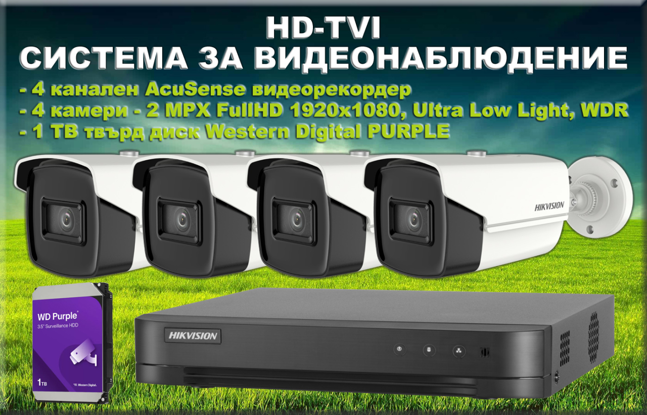 КОМПЛЕКТ ЗА ВИДЕОНАБЛЮДЕНИЕ - 4 камери x 2 MPX с инфрачервено осветление до 50 метра, Ultra Low Light + 4 канален AcuSense DVR + 1 TB Western Digital PURPLE