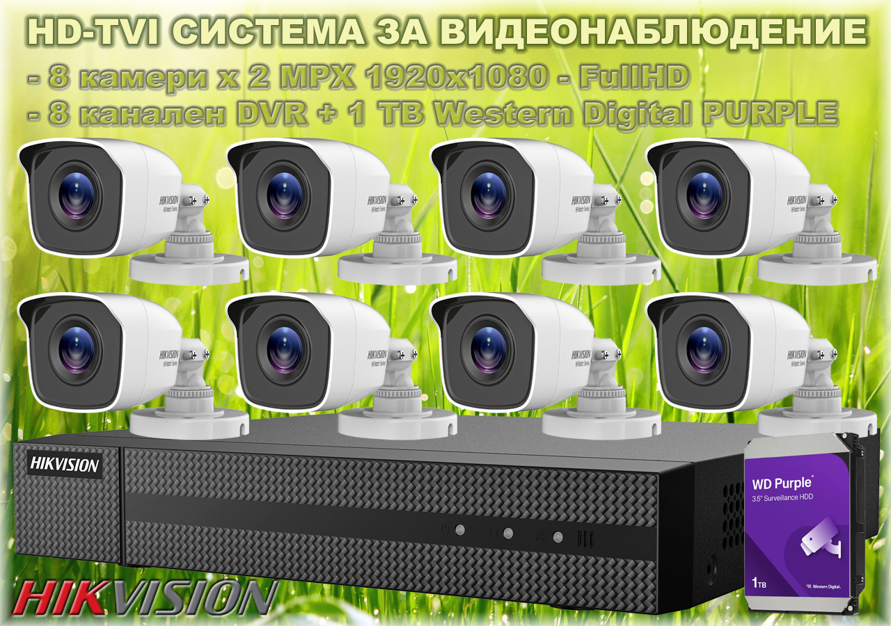КОМПЛЕКТ ЗА ВИДЕОНАБЛЮДЕНИЕ - 8 камери x 2 MPX, 8 канален DVR + 1 TB Western Digital PURPLE