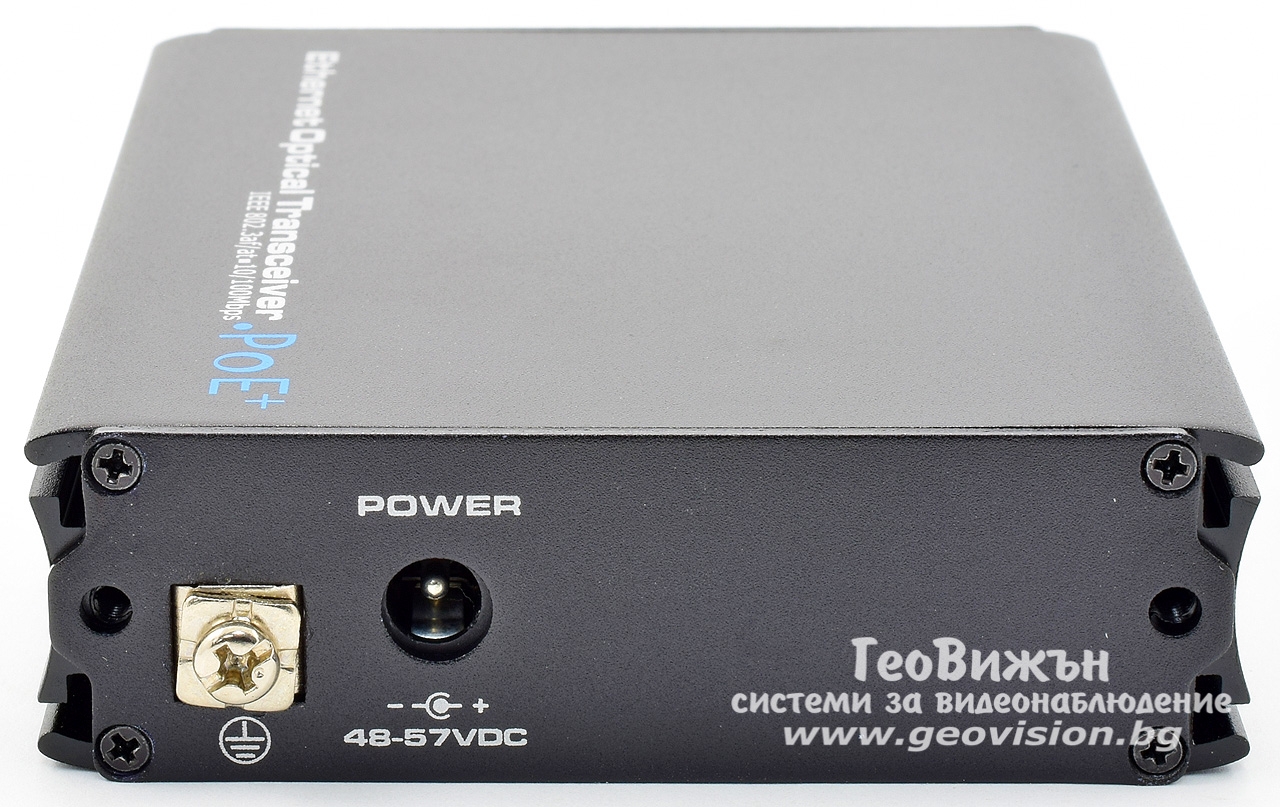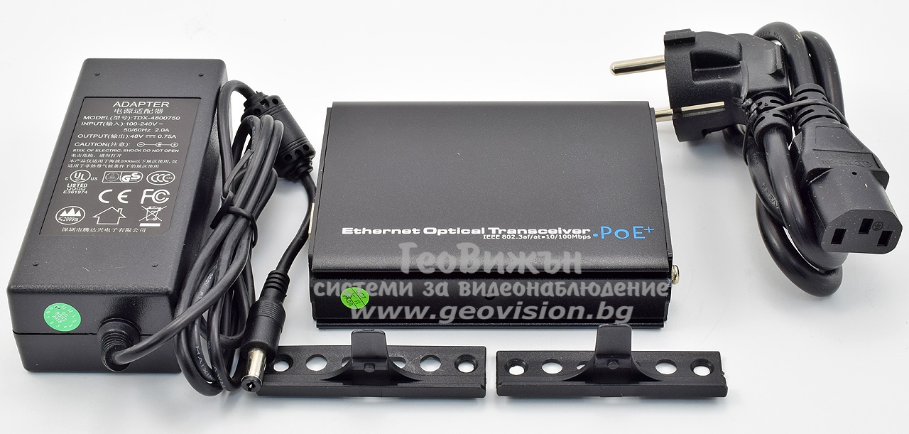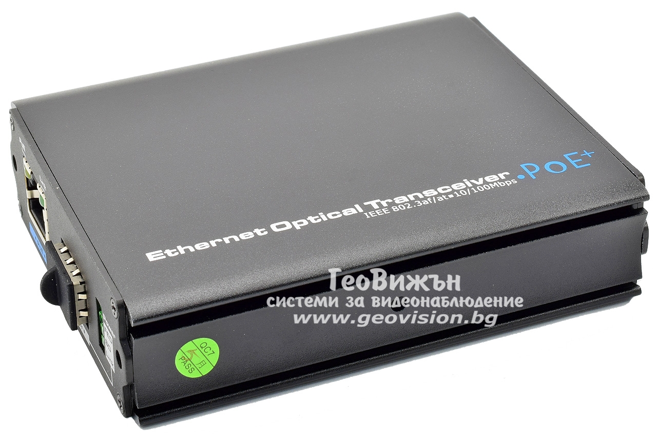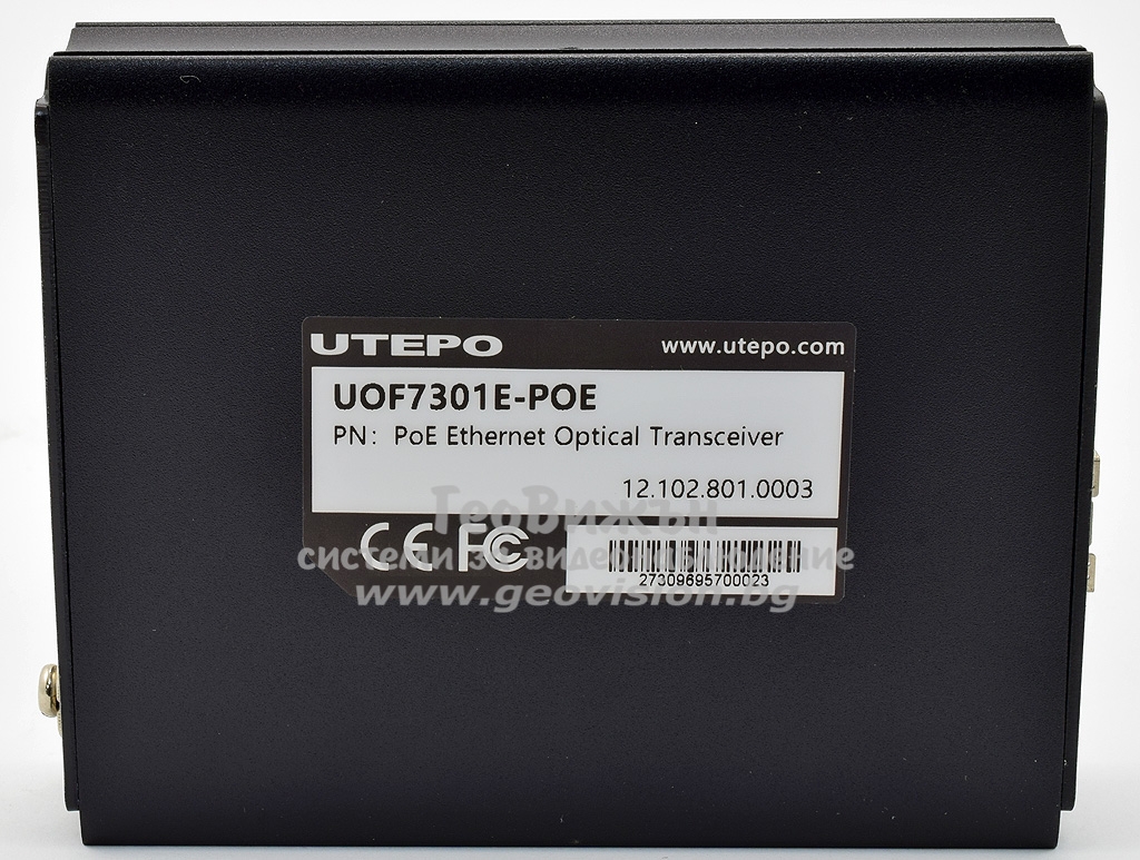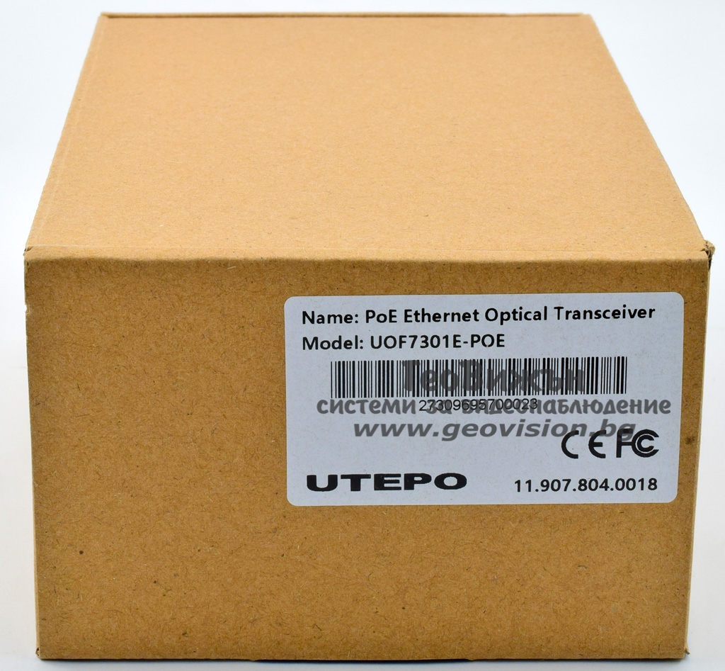 Медиа конвертор за пренос на видео и данни по оптичен кабел до 20 км с PoE+ UTEPO UOF7301E-POE: Ethernet порт + 1 x Fiber optic порт (SFP), 10/100Mbps full/half duplex, Ethernet port transmission distance 100 m, Fiber Port Bandwidth 155 Mbps, automatic MDI/MDIX, PoE+ поддръжка IEEE 802.3af/at, за монтаж на стена или din шина, алуминиев корпус, вградена гръмозащита, DC48-55V 3W, със захранващ адаптер.