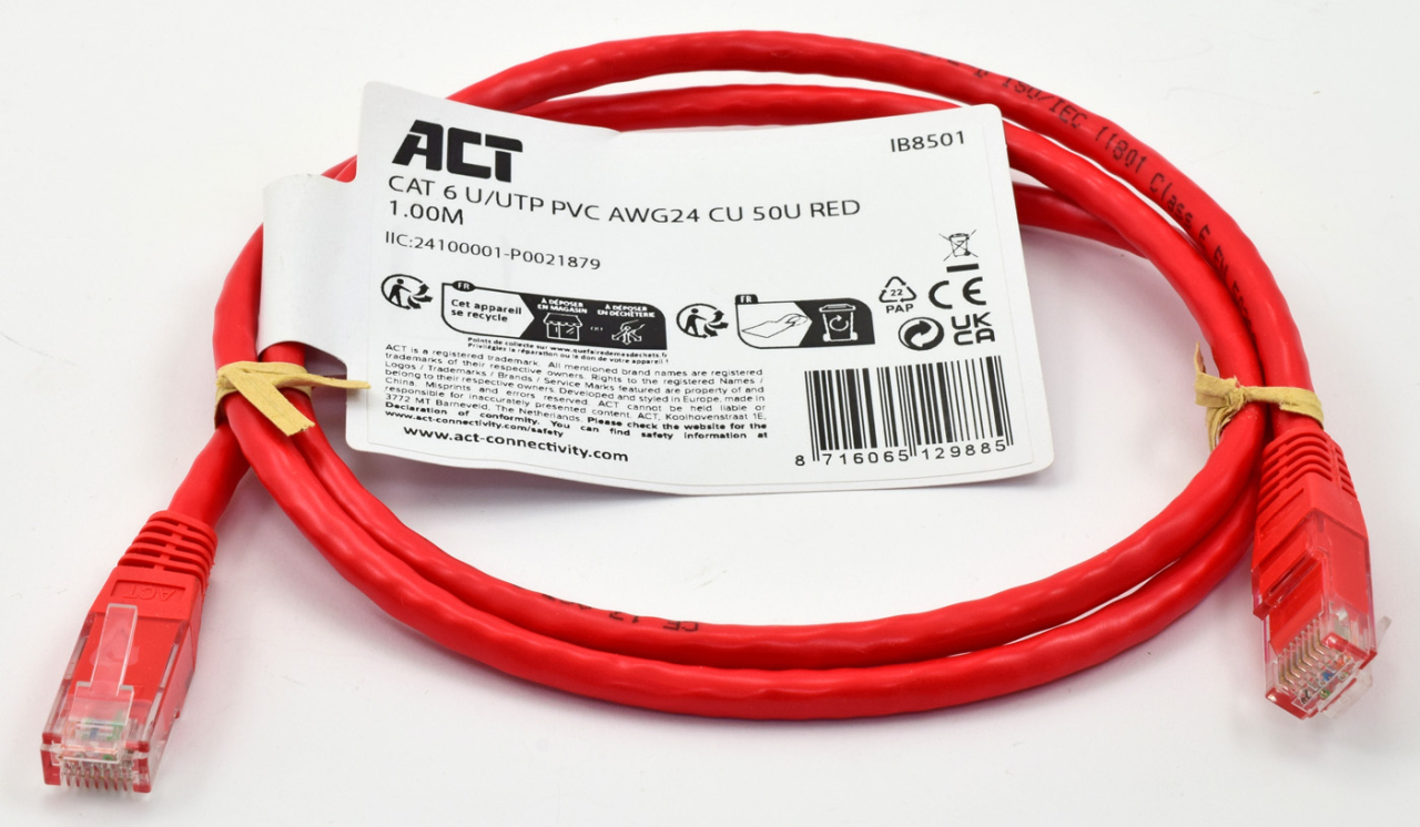 Мрежов LAN кабел ACT IB8501: U/UTP CAT.6, 4x2xAWG24, 250 Mhz, CU медни проводници, кримпнати RJ45 конектори с позлатени пинове, ПВЦ външна изолация - 1 метър