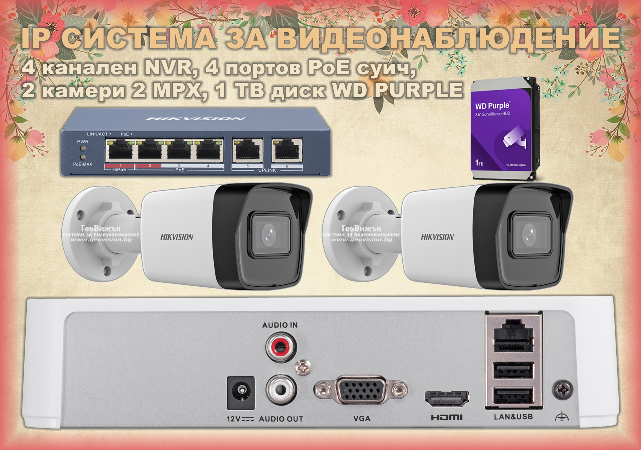 Система за видеонаблюдение HIKVISION с 2 корпусни мрежови IP камери 2 мегапиксела, 4 канален мрежов видеорекордер /NVR/, 4 портов PoE суич, 1 TB диск WD PURPLE