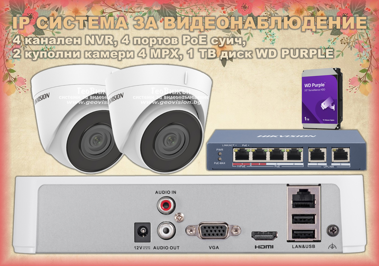 Система за видеонаблюдение HIKVISION с 2 куполни мрежови IP камери 4 мегапиксела, 4 канален мрежов видеорекордер /NVR/, 4 портов PoE суич, 1 TB диск WD PURPLE