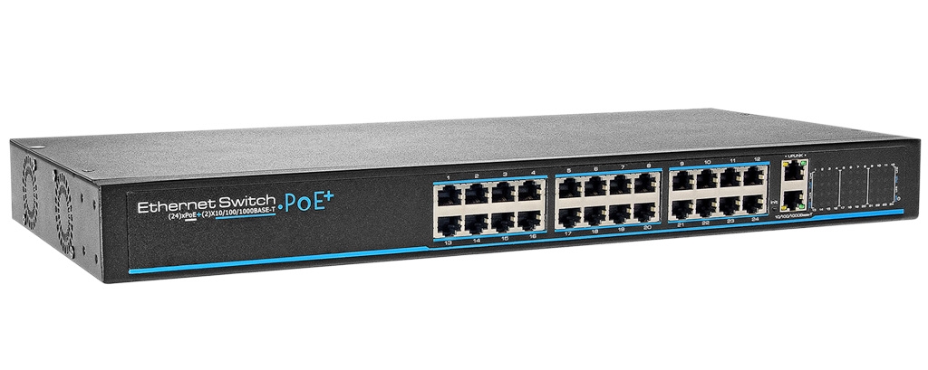 UTEPO UTP3-SW24-TP420: 26 портов суич с 24 x 10/100 Mbps PoE порта за IP камери + 2 x 1 Gbps uplink порта, до 30 W на порт. Общ PoE капацитет 380 W.