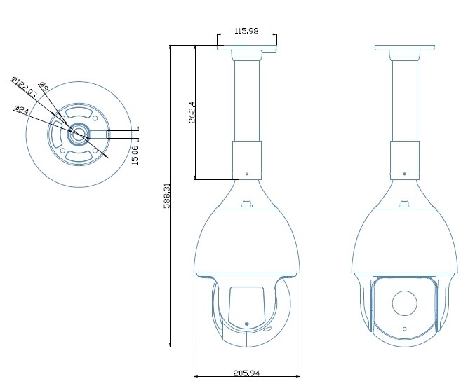 1/2.9" SONY progressive scan CMOS, Frame rate: 25 fps (1920×1080), минимално осветление 0 Lux - вижда при пълен мрак, варифокален обектив с автоматичен фокус 4.7-84.6 mm и с ъгъл на видимост от 75 до 10 градуса, BLC, AWB, AGC, AES, D-WDR, 3D-DNR шумов филтър, механичен инфрачервен филтър, 360° Pan / 93° Tilt auto flip, 220 позиции, 3 обхода, 16 точки, IP66, DC12V - 3A, Алуминиев корпус, за външен монтаж. RS-485. UTC, Pelco P и Pelco D протоколи. HD BNC видео изход, OSD меню за настройки. С отоплител, вградена гръмозащита и стенна стойка. Камерата и менюто се управляват по коаксиалния кабел от видеорекордер. Без захранване.