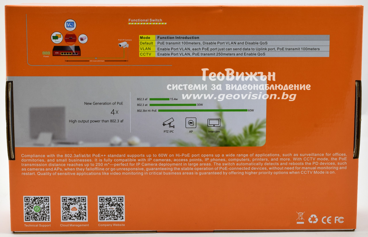 - Default - Всички портове комуникират помежду си. Пренос на Ethernet+PoE до 100 метра със 100 Mbps