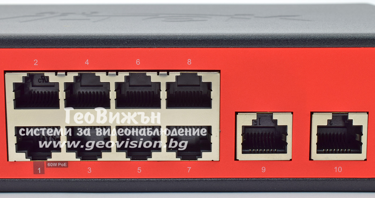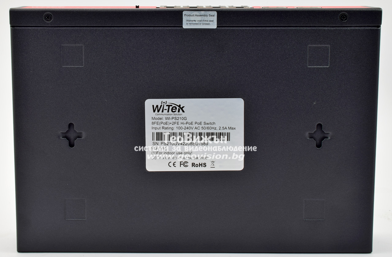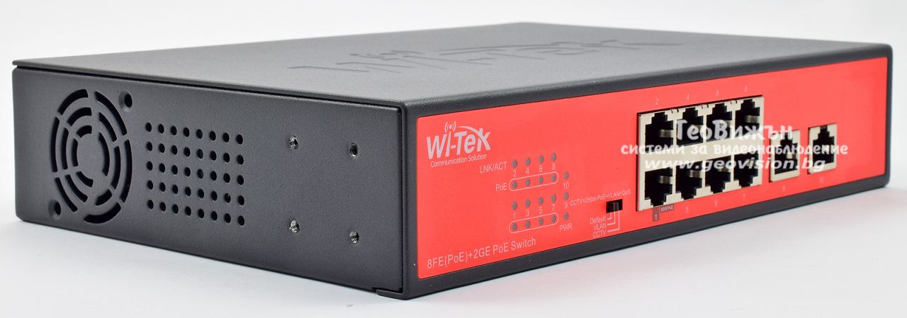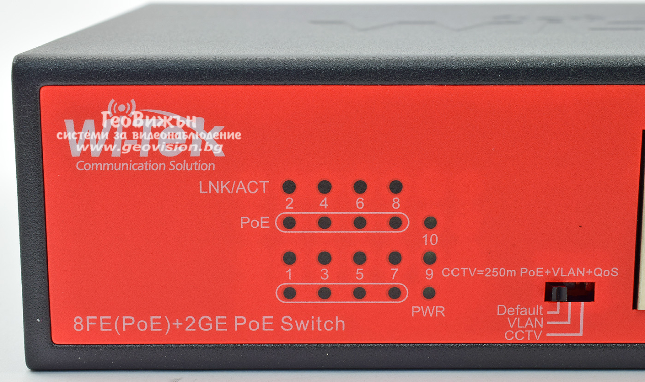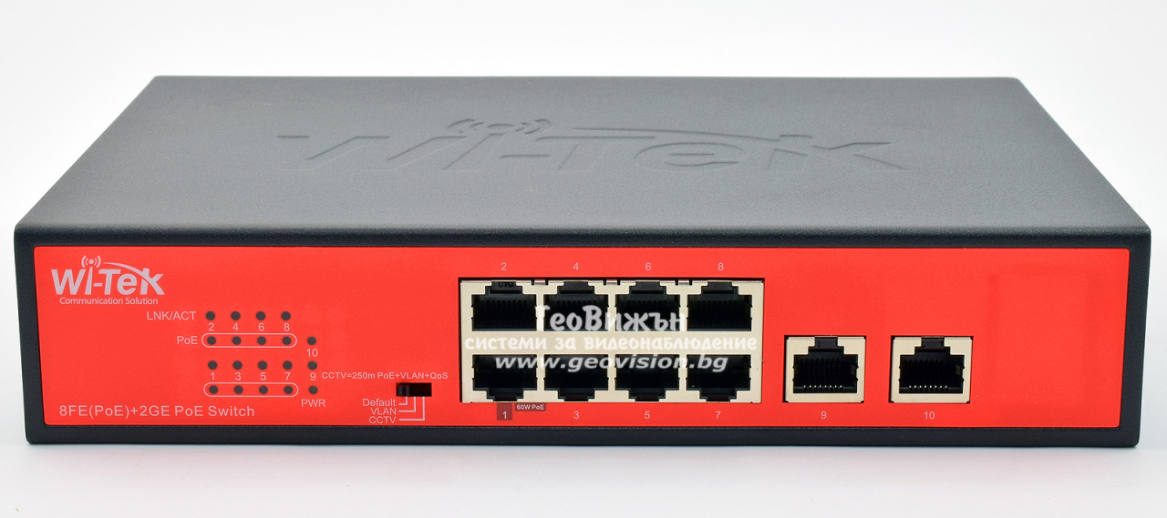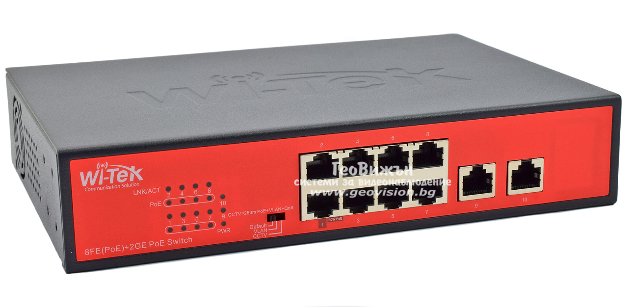 Wi-Tek WI-PS210G: 10 портов суич с 8 x 10/100 Mbps PoE порта + 2 x 1 Gbps uplink порта. Hi-PoE до 60W на порт 1. До 30 W на портове 2-8. Общ PoE капацитет 120 W