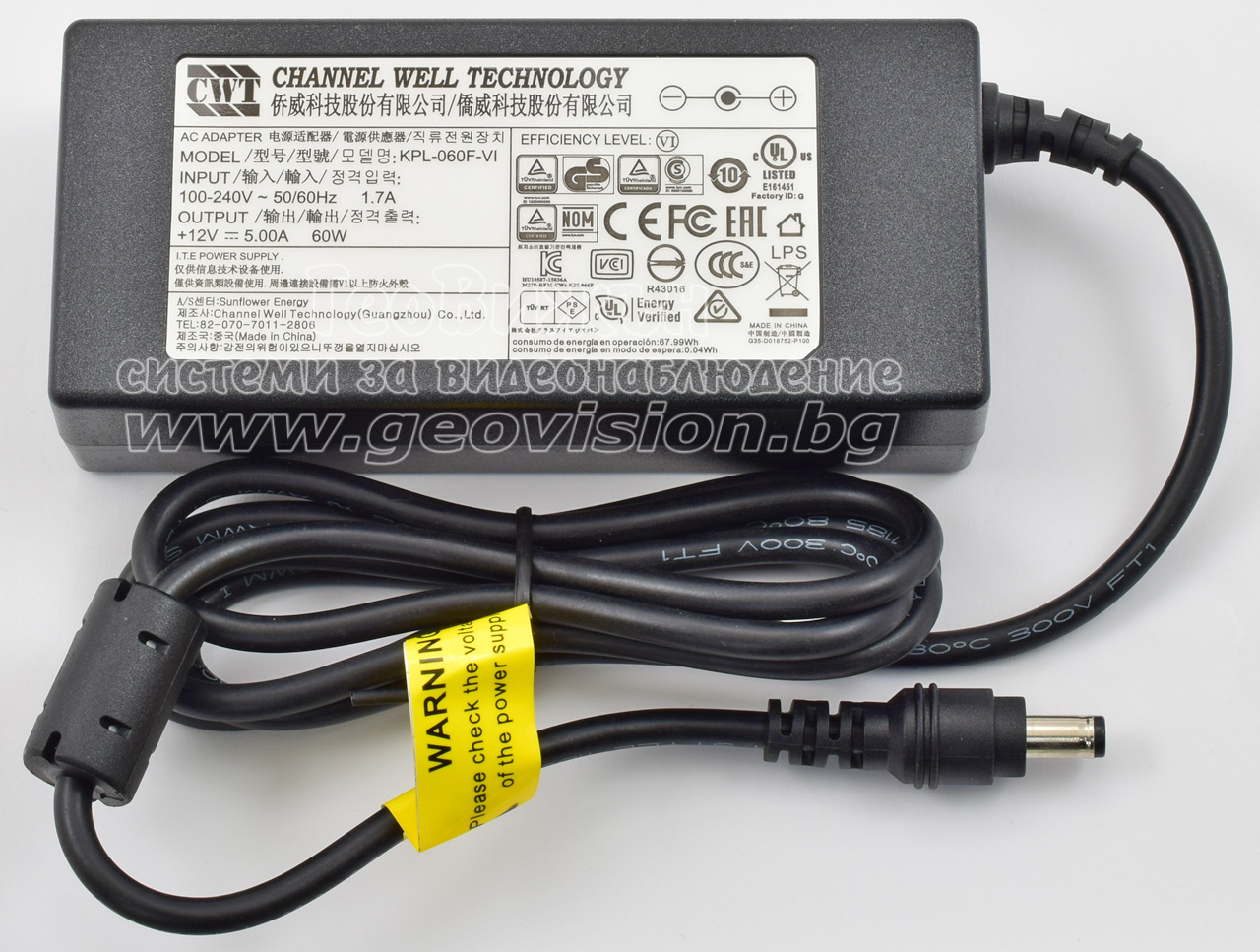 Захранващ адаптер за видеорекордери и камери KPL-060F-VI-2: AC100-240V - DC12V, 5 Amp/60 W, стабилизиран. Захранваща букса 5.5x2.1 mm