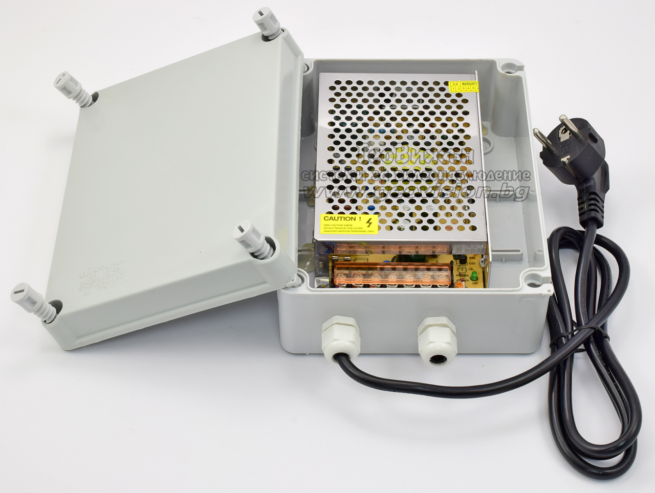 Захранващ блок в ПВЦ кутия CV-PSU12V5A: 220 V AC - 12 V DC, 5 A/60 W, стабилизиран, 2 DC изхода, със захранващ кабел