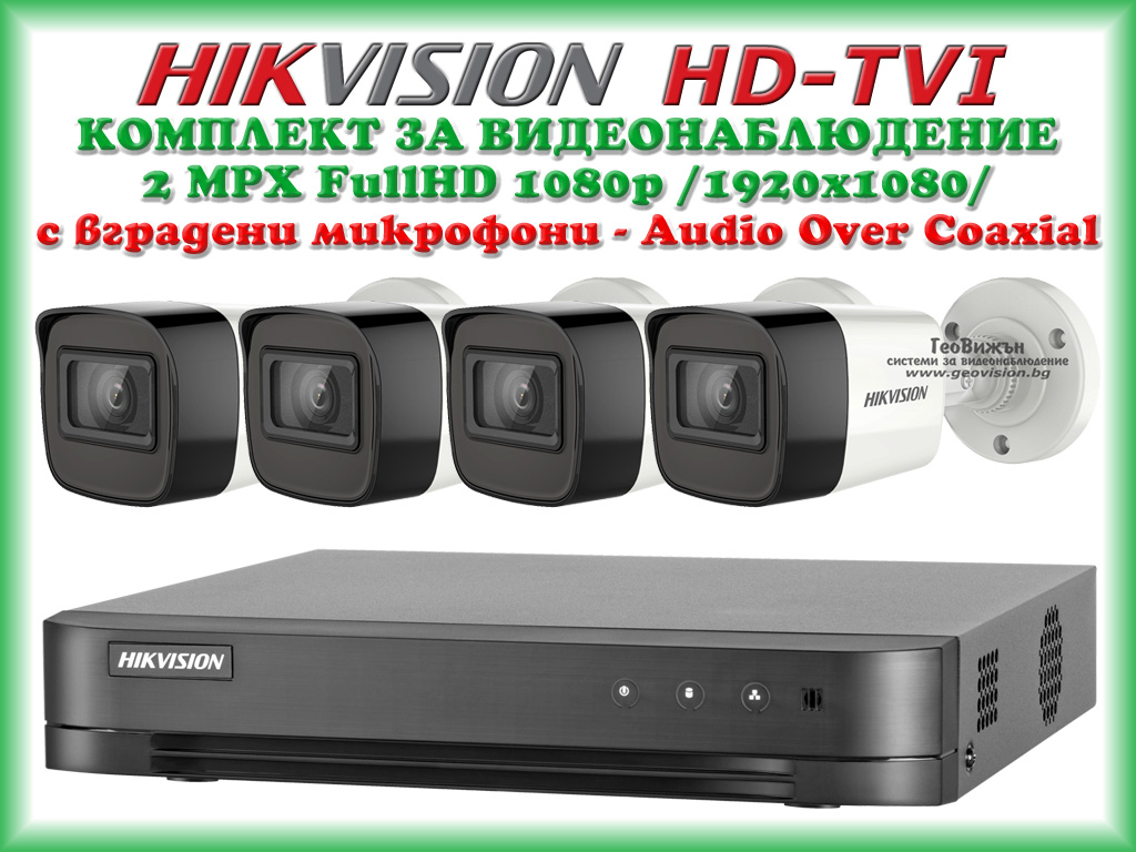 КОМПЛЕКТ ЗА ВИДЕОНАБЛЮДЕНИЕ - 2 мегапиксела FullHD 1080p, с 4 инфрачервени корпусни камери за външен и вътрешен монтаж с вградени микрофони /Audio Over Coaxial/