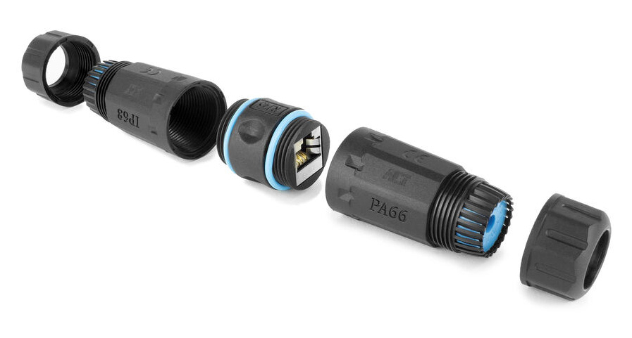 Екраниран съединител за мрежови CAT5E/CAT6A кабели. Съединителят е предназначен за свързване на два UTP/FTP кабела с RJ45 конектори. Монтажът е напълно без инструменти - включете конекторите и завъртете водоустойчивите части заедно. Ако съществуващият кабел не е достатъчно дълъг за да достигне желаната крайна точка, използвайте съединител за свързване на два кабела, удължавайки общата дължина, без да се налага подмяна на целия кабел.