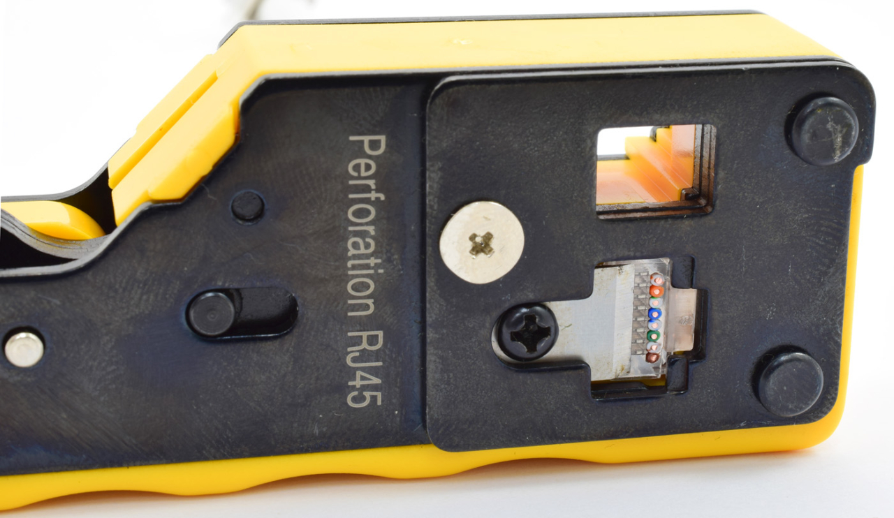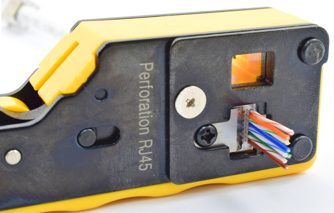 - Клещите са подходящи за конектори RJ45 с проходи, през които кабелите минават и излизат, което прави проверката на правилното разположение много по-лесна и сигурна.