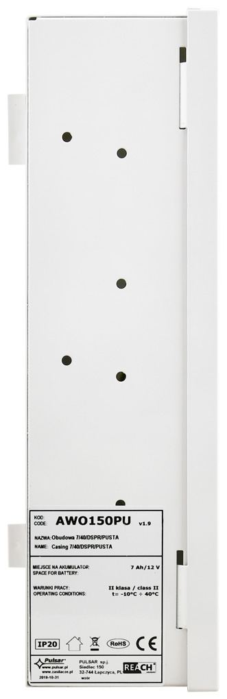 Кутията е предназначена за монтаж на отворени захранващи блокове, алармени системи, системи за контрол на достъп и др. Изработена е от стоманен лист с дебелина 0.7 мм, в бял цвят RAL9003. Окомплектована е с комплект винтове за монтаж на захранването в кутията. Предназначена е за стенен вътрешен монтаж. Поддържа всички блокове от серията Pulsar PS и има антикорозионно покритие.
