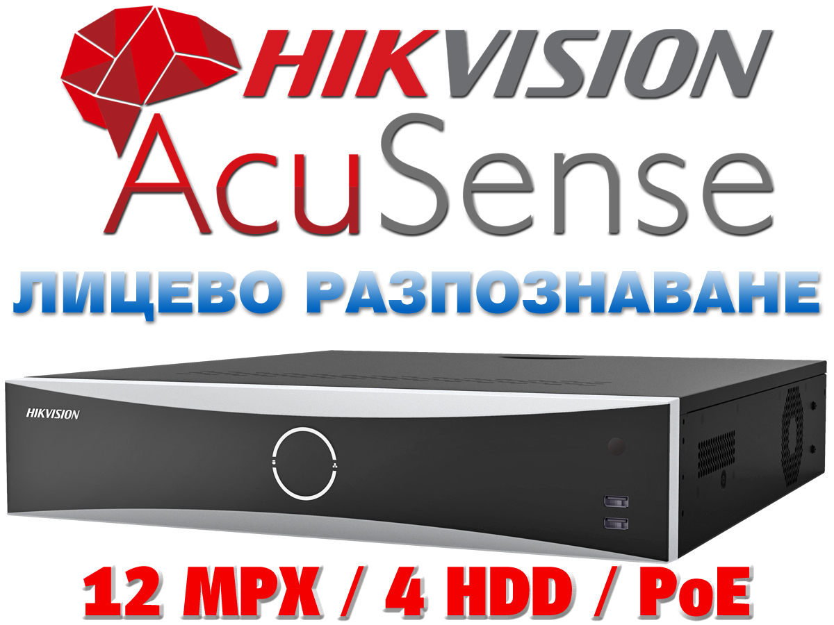 32 канален професионален AcuSense IP мрежов видеорекордер HIKVISION: DS-7732NXI-K4/16P(D). С вградени 16 PoE порта. Поддържа 32 мрежови IP камери до 12 MPX. 4 SATA порта