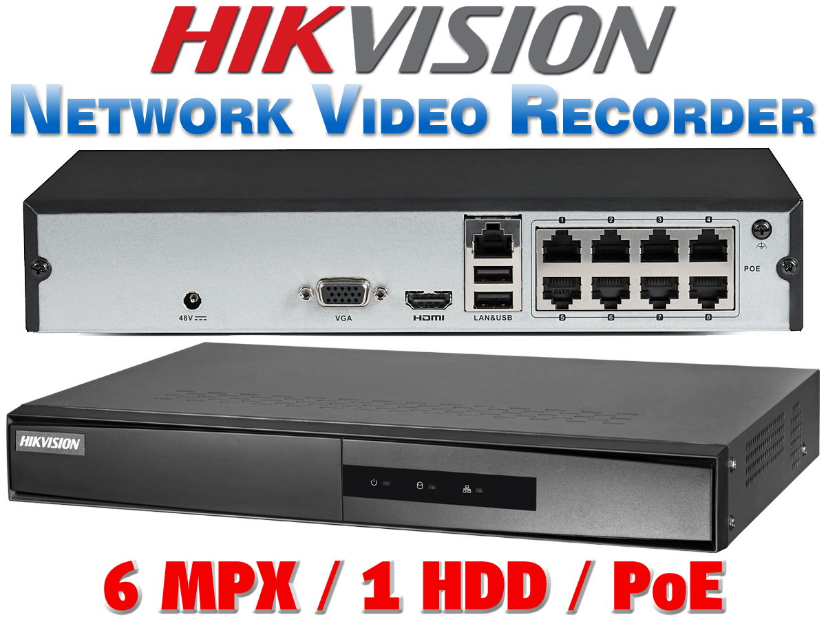 8 канален бюджетен IP мрежов видеорекордер HIKVISION: DS-7108NI-Q1/8P/M(D). С вградени 8 PoE порта. Поддържа 8 мрежови IP камери до 6 MPX. 1 SATA порт