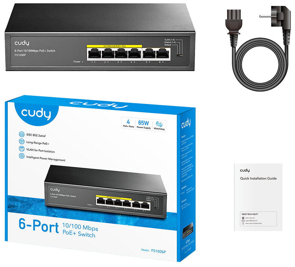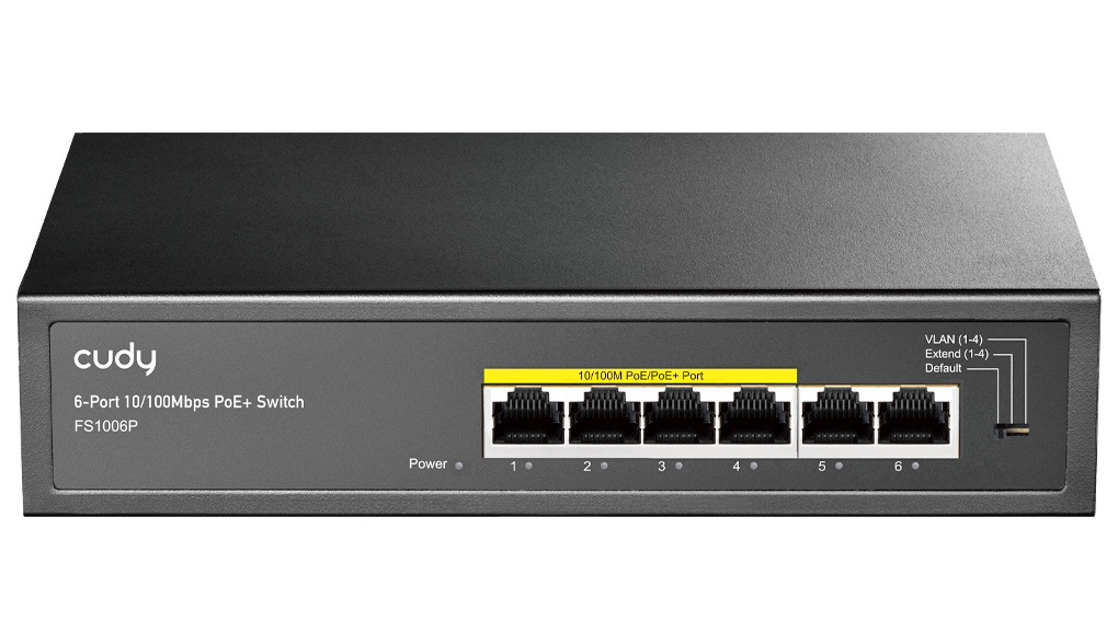 Cudy FS1006P V3.0: 6 портов суич с 4 x 10/100 Mbps PoE порта + 2 x 10/100 Mbps RJ45 uplink порта. До 30 W на PoE порт. Общ PoE бюджет 60 W