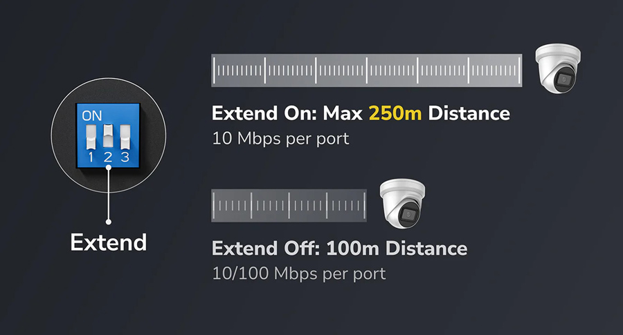 - Extend (Режим на удължаване на връзката): Този режим е предназначен за разширяване обхвата на данни + захранване, преодолявайки физическите ограничения на Ethernet стандарта от 100 метра. Обхватът на PoE захранването и преносът на данни за портове 9-16 може да бъде удължен до 250 метра. За да се постигне това, скоростта на предаване за тези портове става фиксирана на 10 Mbps.