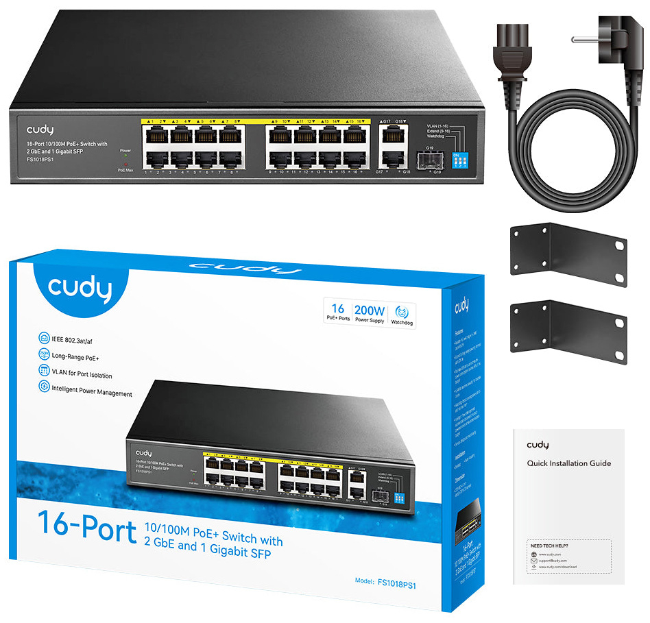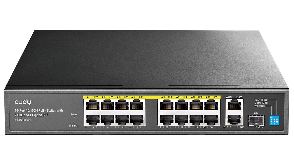 Cudy FS1018PS1 V4.0: 18 портов суич с 16 x 10/100 PoE порта + 1 x 10/100/1000 Mbps RJ45 uplink порт + 1x10/100/1000 Mbps combo порт (RJ45 и SFP). До 30 W на PoE порт. Общ PoE бюджет 200 W