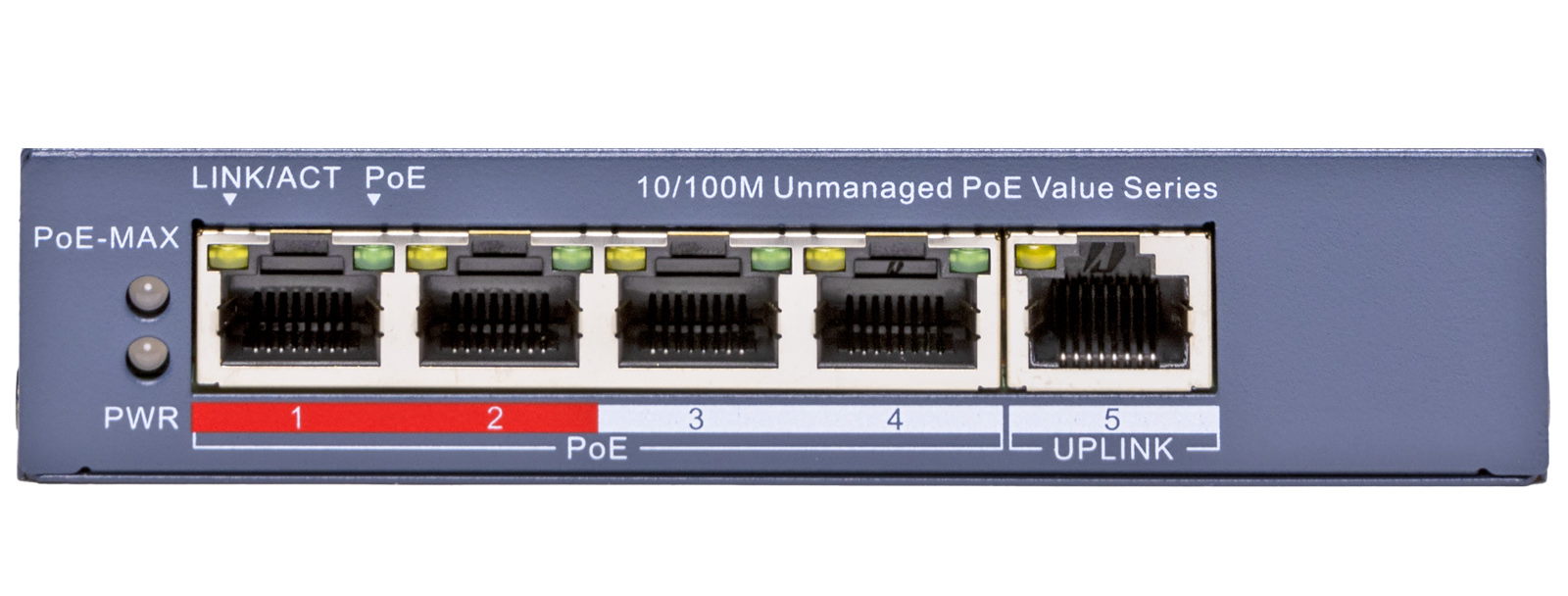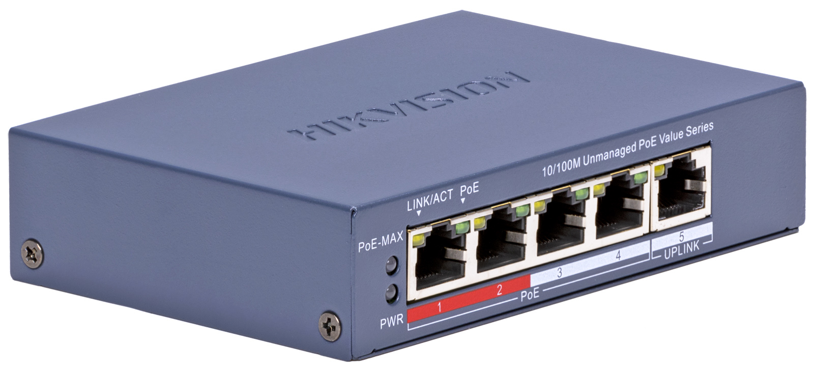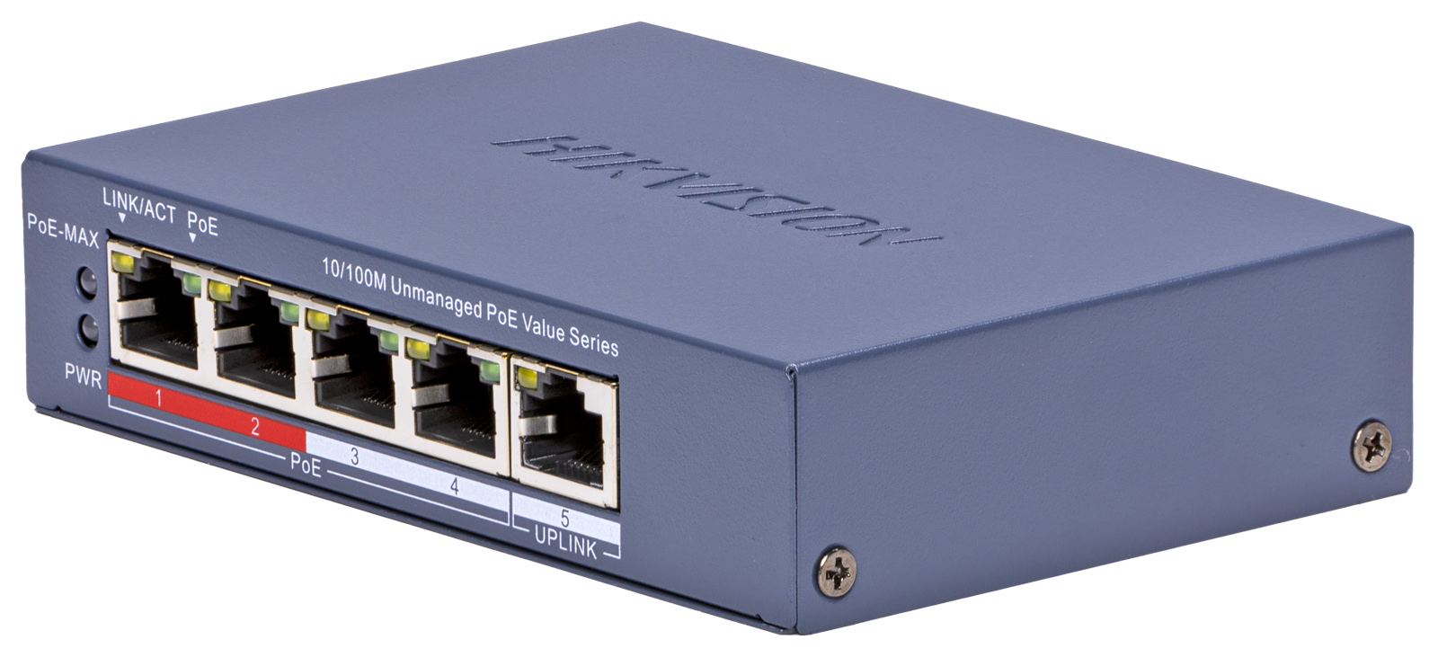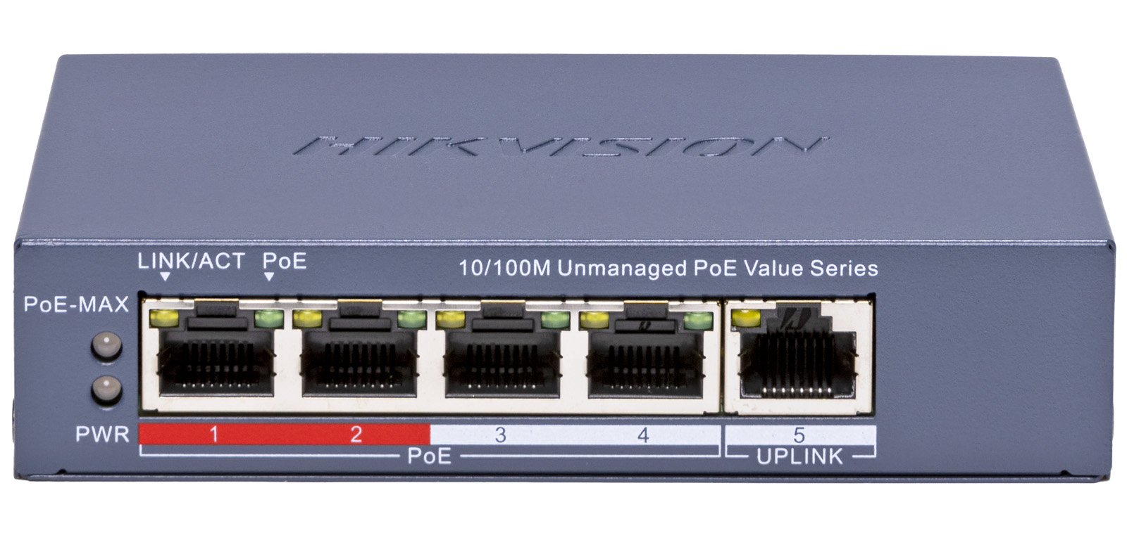 HIKVISION DS-3E0105P-E/M(C): 5 портов суич с 4 x 10/100 Mbps PoE порта + 1 x 10/100 Mbps RJ45 uplink порт. До 30 W на порт. Общ PoE бюджет 45 W