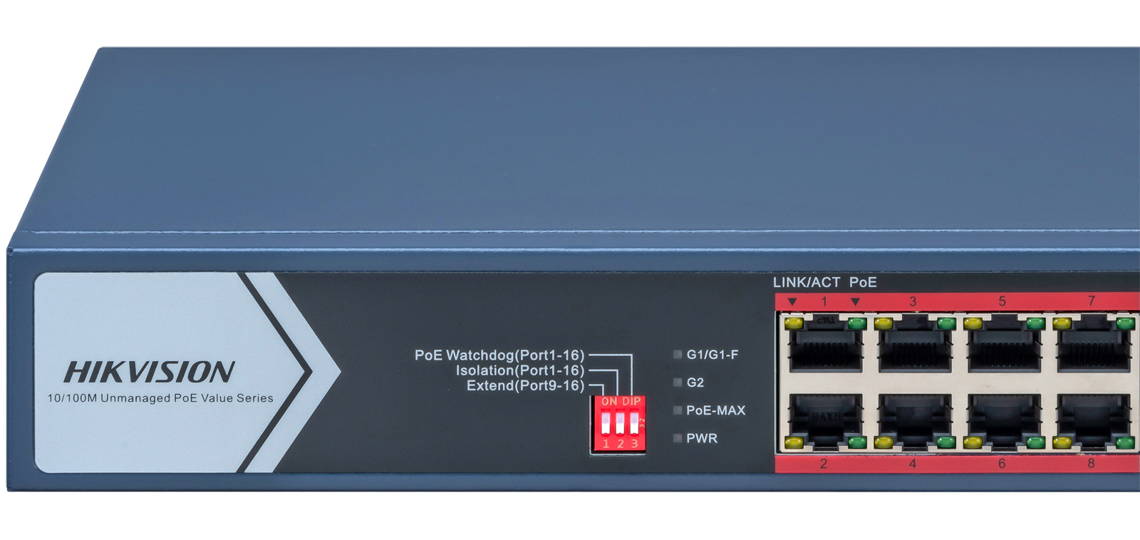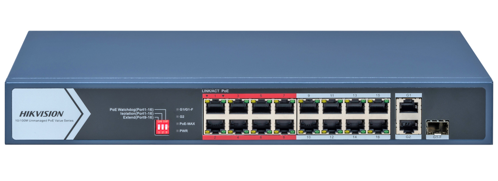 HIKVISION DS-3E0318P-E/M(C): 18 портов суич с 16x10/100 Mbps PoE порта + 1x10/100/1000 Mbps RJ45 uplink порт + 1x10/100/1000 Mbps RJ45 combo порт (RJ45 и SFP). Общ PoE бюджет 130 W