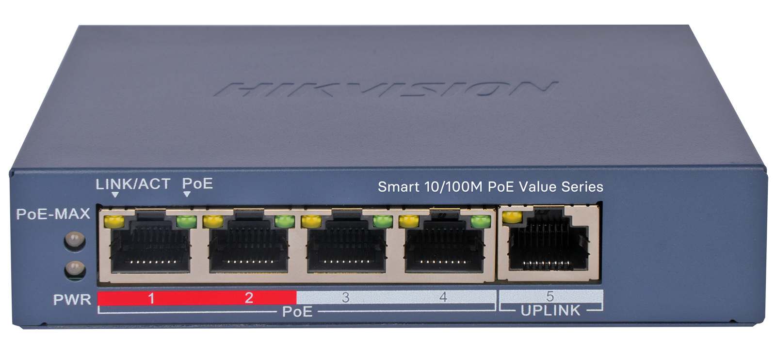 HIKVISION DS-3E1105P-EI/M V2: Управляем 5 портов суич с 4 x 10/100 Mbps PoE порта + 1 x 10/100 Mbps uplink порт. До 30 W на порт. Общ PoE бюджет 45 W