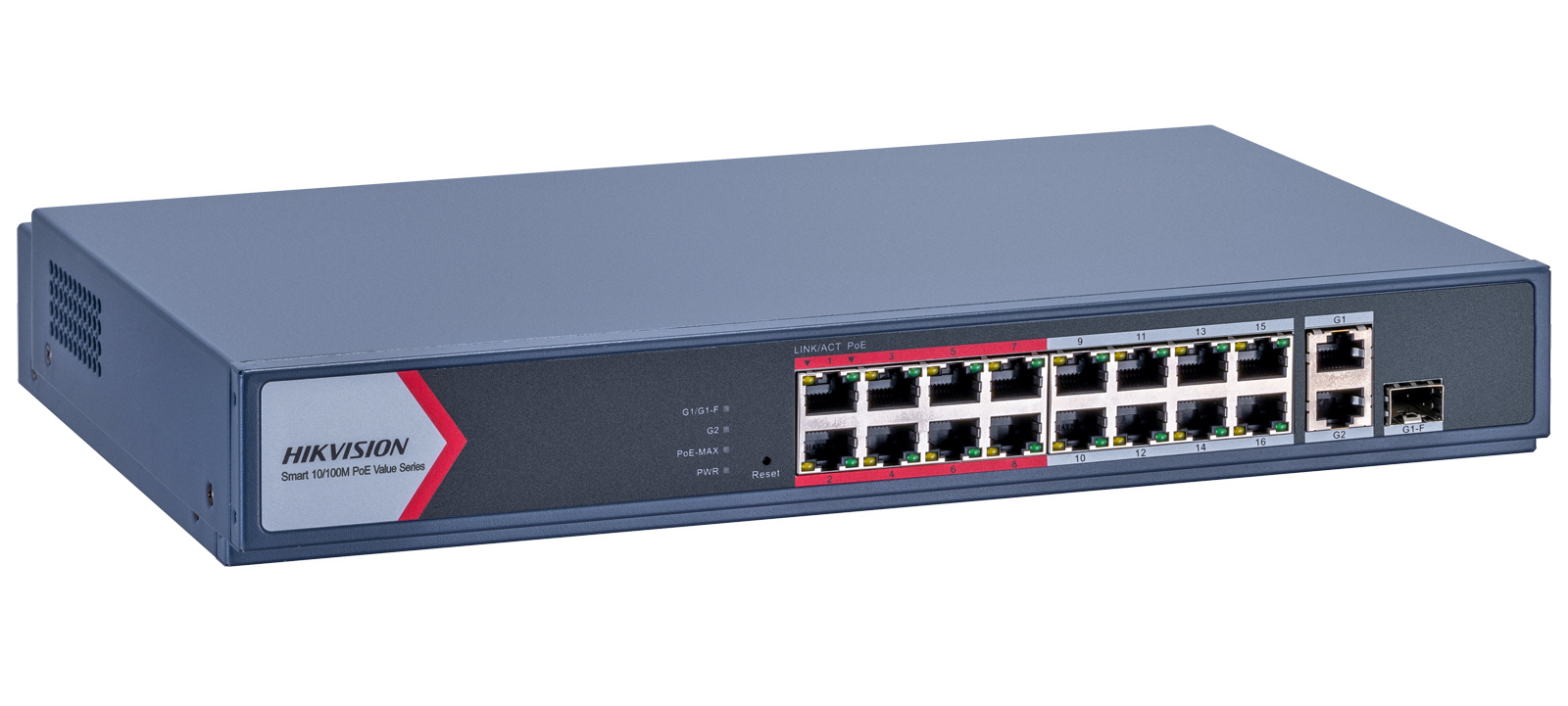 HIKVISION DS-3E1318P-EI/M : Управляем 18 портов суич с 16x10/100 Mbps PoE порта + 1x10/100/1000 Mbps RJ45 uplink порт + 1x10/100/1000 Mbps RJ45 combo порт (RJ45 и SFP). Общ PoE бюджет 130 W