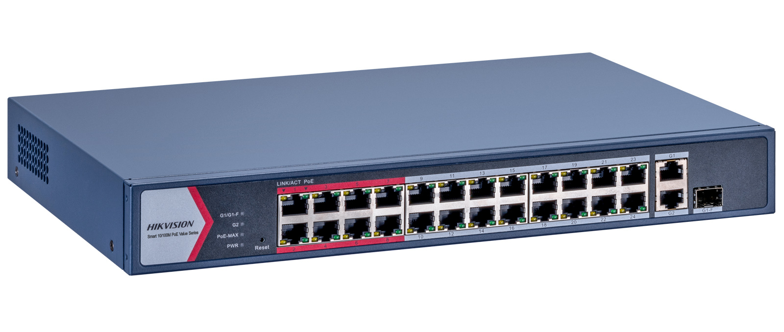 HIKVISION DS-3E1326P-EI/M : Управляем 26 портов суич с 24x10/100 Mbps PoE порта + 1x10/100/1000 Mbps RJ45 uplink порт + 1x10/100/1000 Mbps RJ45 combo порт (RJ45 и SFP). Общ PoE бюджет 230 W