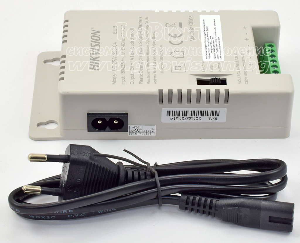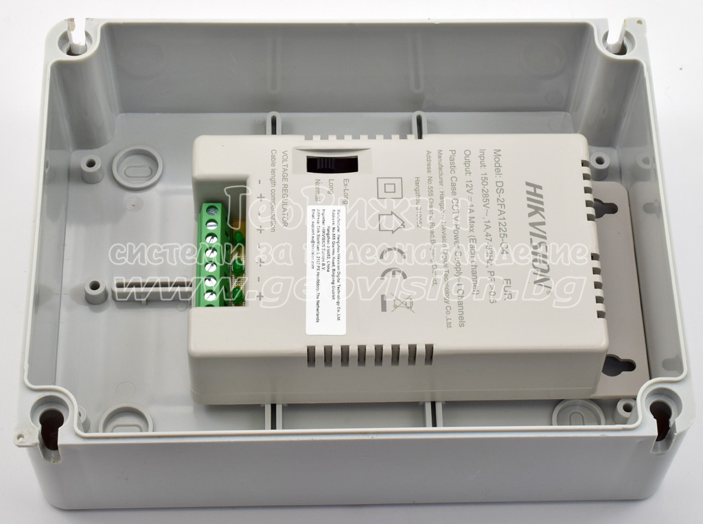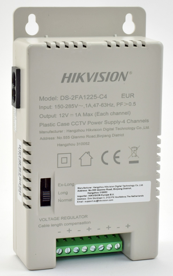 4 канален захранващ блок HIKVISION DS-2FA1225-C4: 150-285 V AC - 12V/13.5C/15V DC, 4 A/48 W, 4 изхода със самовъзстановяващи се предпазители по 1 А/12 W и LED индикация на всеки канал