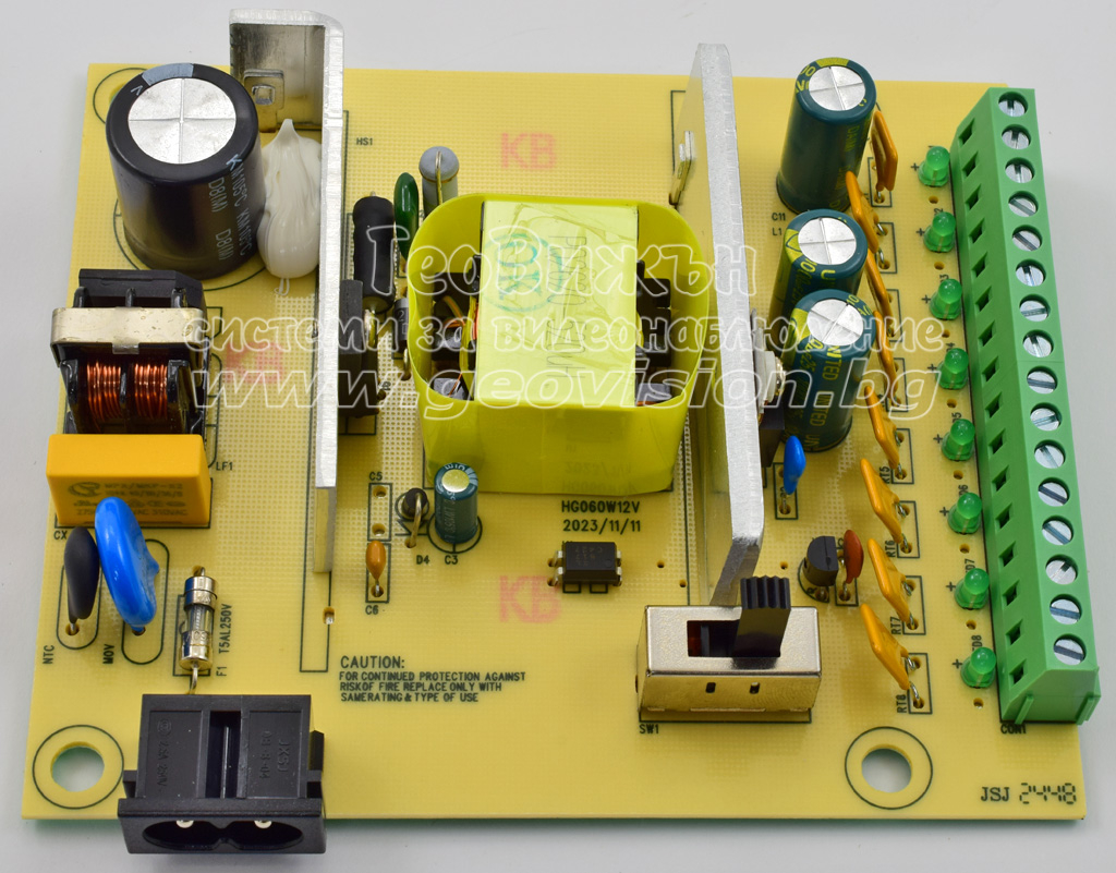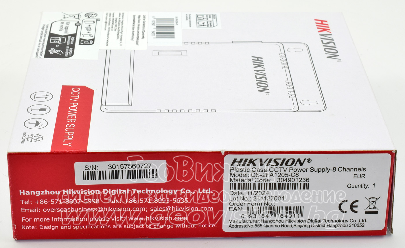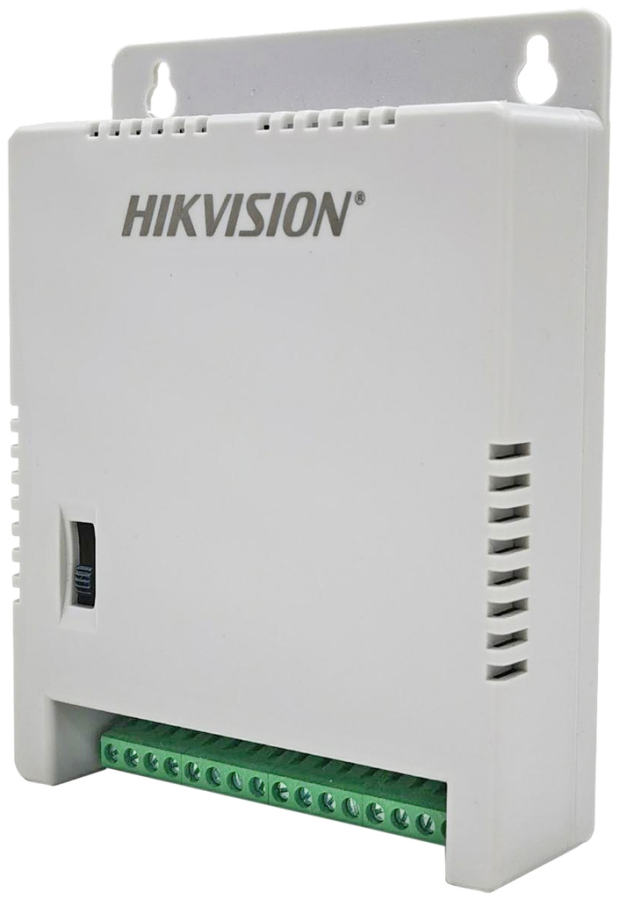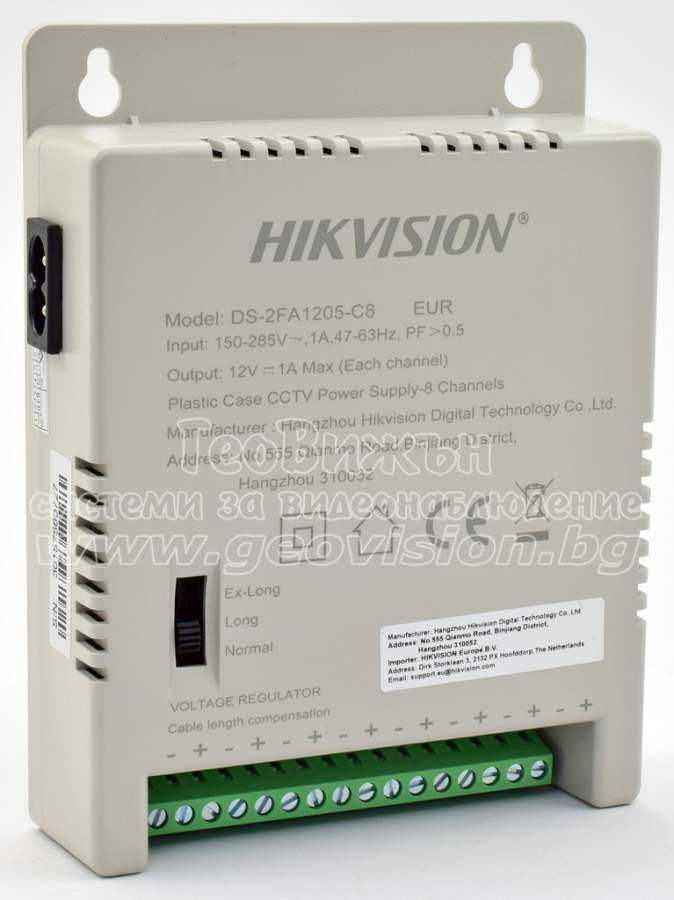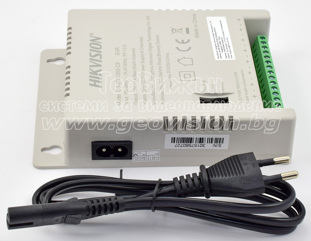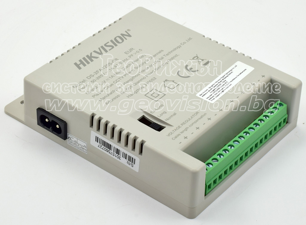 8 канален захранващ блок HIKVISION DS-2FA1205-C8: 150-285 V AC - 12V/13.5C/15V DC, 5 A/60 W, 8 изхода със самовъзстановяващи се предпазители по 1 А/12 W и LED индикация на всеки канал